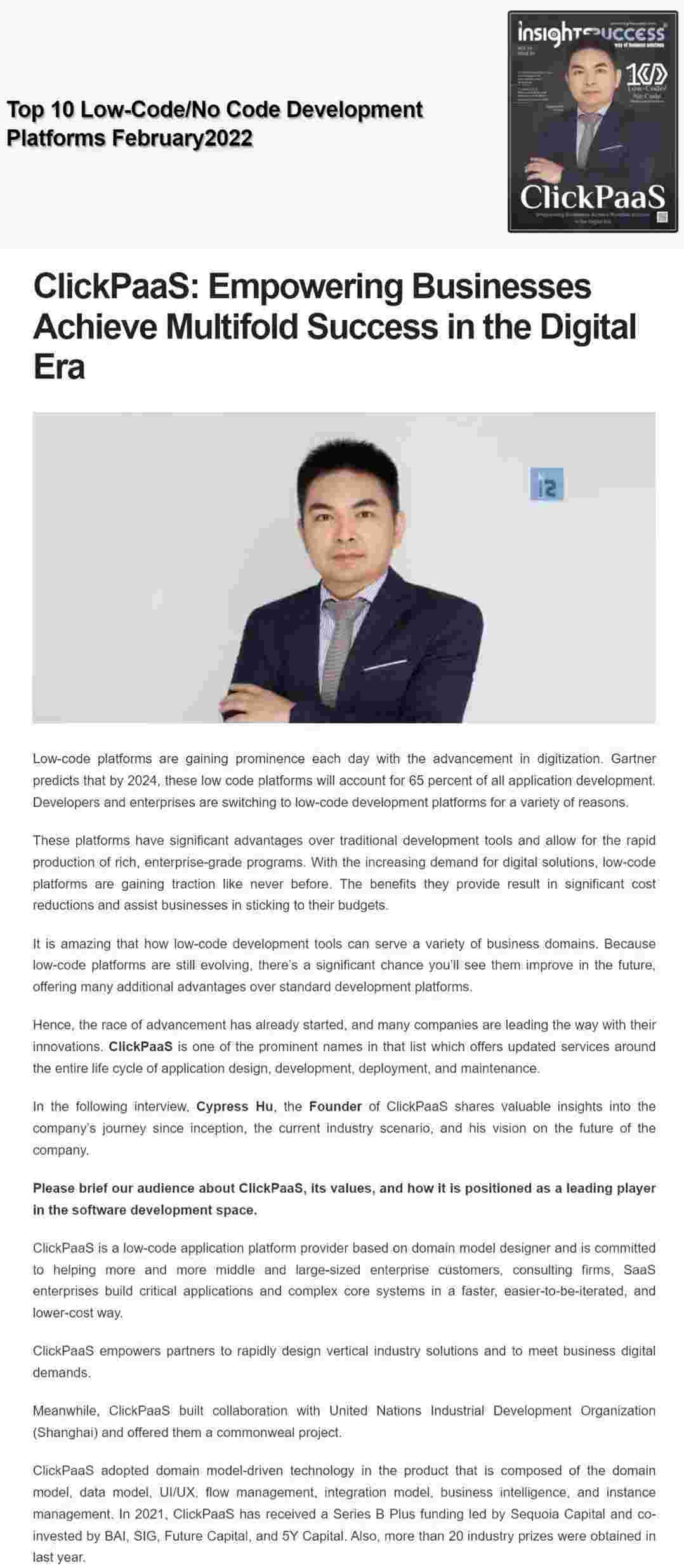 2022年年初,,钱能钱包入选外媒Insights Success低代码/无代码开发平台 Top10,,创始人、、CEO胡柏受邀接受专访并荣登封面人物,,,,他与Insights Success的读者分享了钱能钱包成立的初心、、、、发展历程、、、当前的行业发展趋势以及他对公司未来的展望。。
